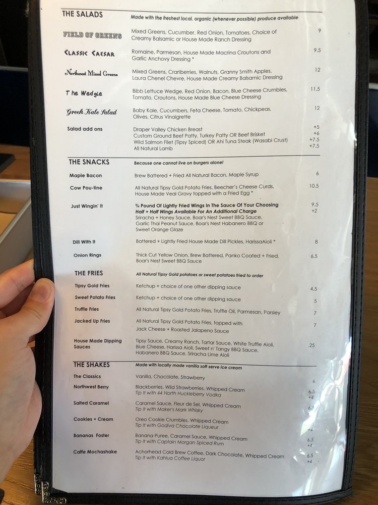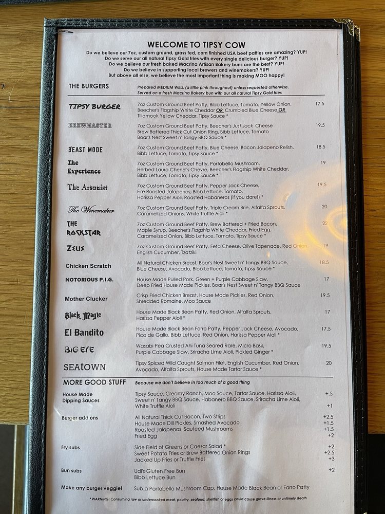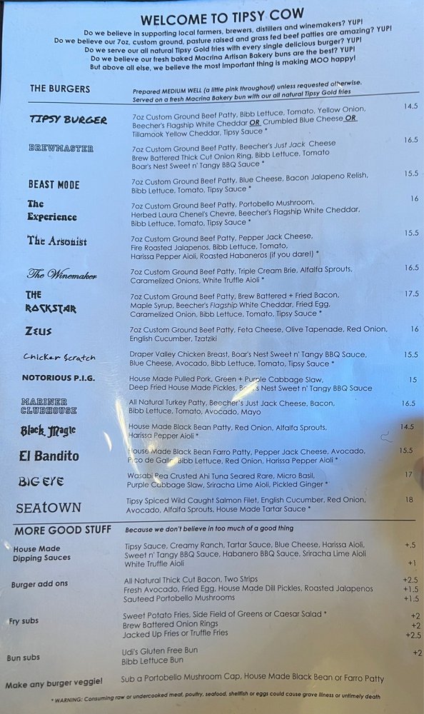 Introducing the menu at Tipsy Cow Burger Bar in Redmond, where you can enjoy a variety of options such as the Tipsy Burger with custom ground grass-fed beef and Beecher's flagship white cheddar, or the Experience Burger with portobello mushrooms and herbed chevre. The snacks menu offers tempting choices like Maple Bacon and Pig Tails, while salads like the Classic Caesar and Butter Lettuce Wedge provide lighter options. Customers rave about the delicious burgers and friendly service, with unique offerings like the Mother Clucker and El Bandito standing out. The ambiance is upscale yet welcoming, perfect for enjoying a meal with friends or family. Don't miss the opportunity to try the mouthwatering burgers and flavorful sides at Tipsy Cow Burger Bar - a top choice in the greater Seattle area.